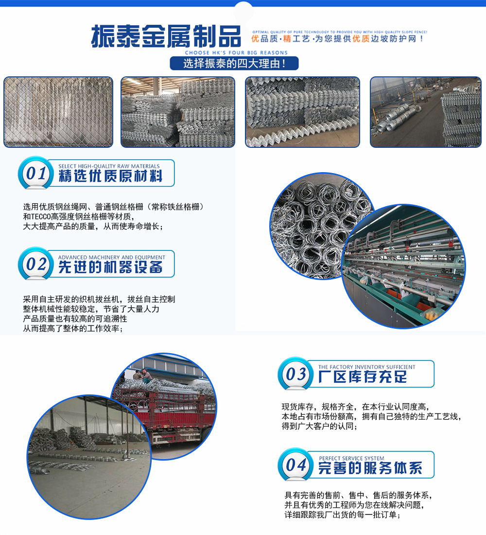 深州市振泰金屬制品有限公司緊鄰絲網(wǎng)之鄉(xiāng)—安平,東距(G45)大廣高速10公里,南距(G1811)石黃高速15公里,北距首都北京250公里,京九鐵路從這里鋪地而過,交通十分便利,河北省深州市231省道90公里處(深州市與安平縣交界處南150米路東),是一家集生產(chǎn),加工,銷售為一體的專業(yè)防護(hù)網(wǎng)廠家。 我廠經(jīng)過多年的研究創(chuàng)新,產(chǎn)品不斷推陳出新,堅(jiān)持技術(shù)創(chuàng)新、科學(xué)管理、誠信經(jīng)營,注重引進(jìn)先進(jìn)的生產(chǎn)技術(shù)設(shè)備,推行標(biāo)準(zhǔn)化生產(chǎn),從原材料采購、生產(chǎn)管理、產(chǎn)品檢測等關(guān)鍵環(huán)節(jié)嚴(yán)格把關(guān),確保了產(chǎn)品質(zhì)量,贏得了客戶的信賴。
